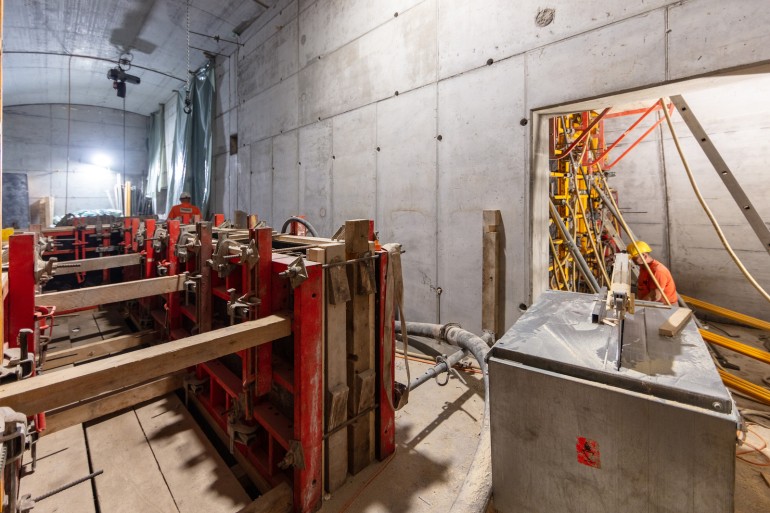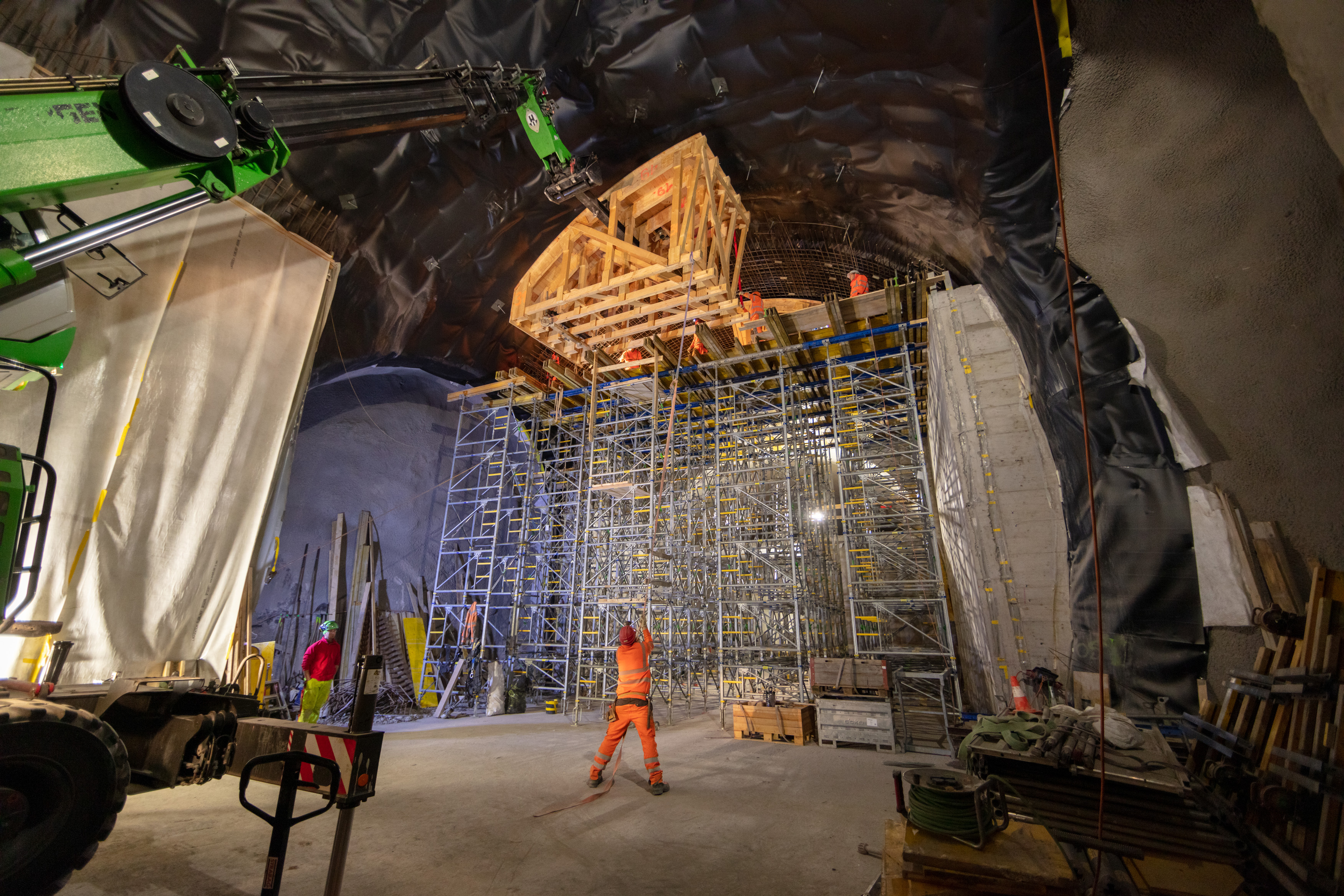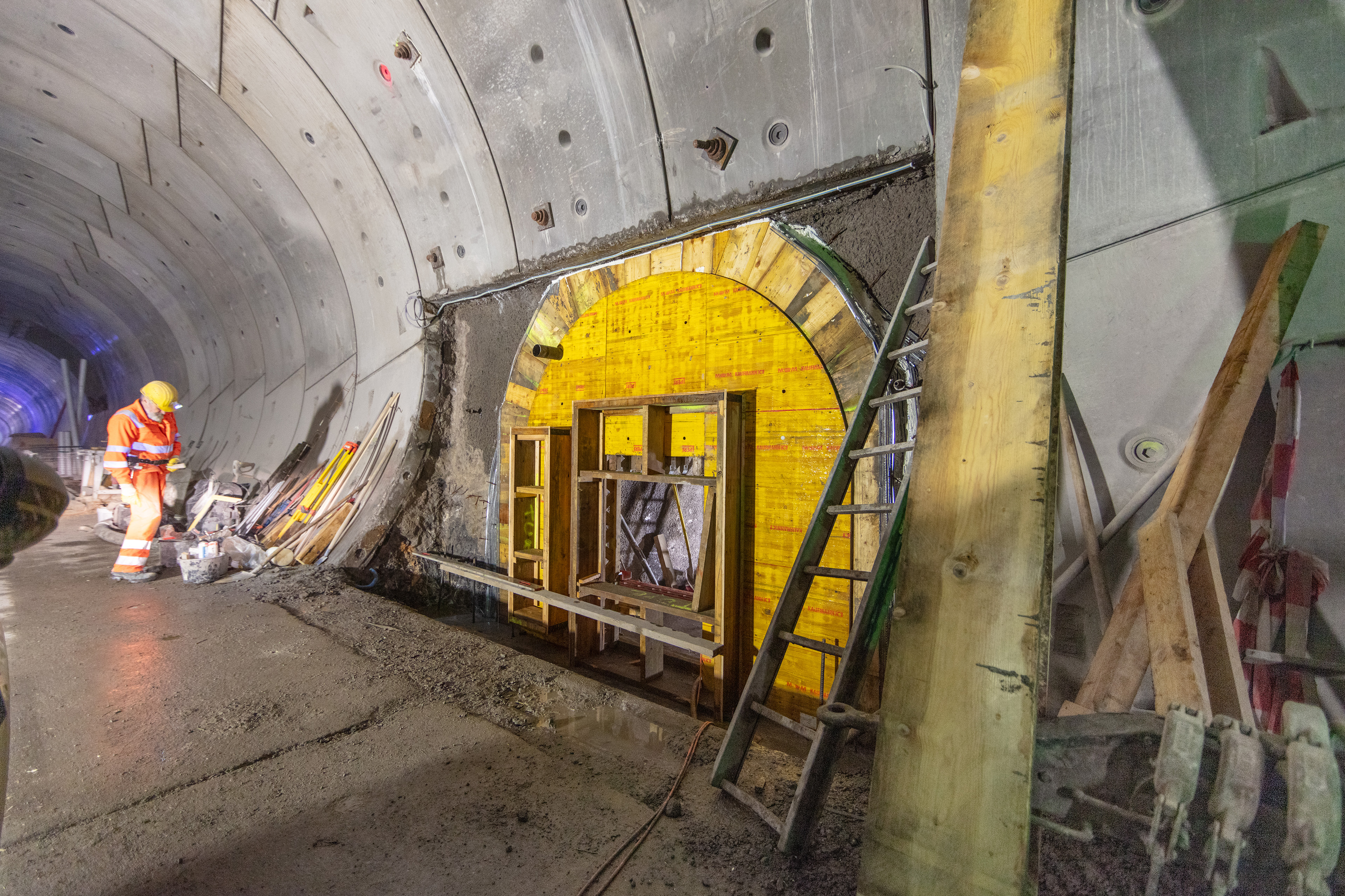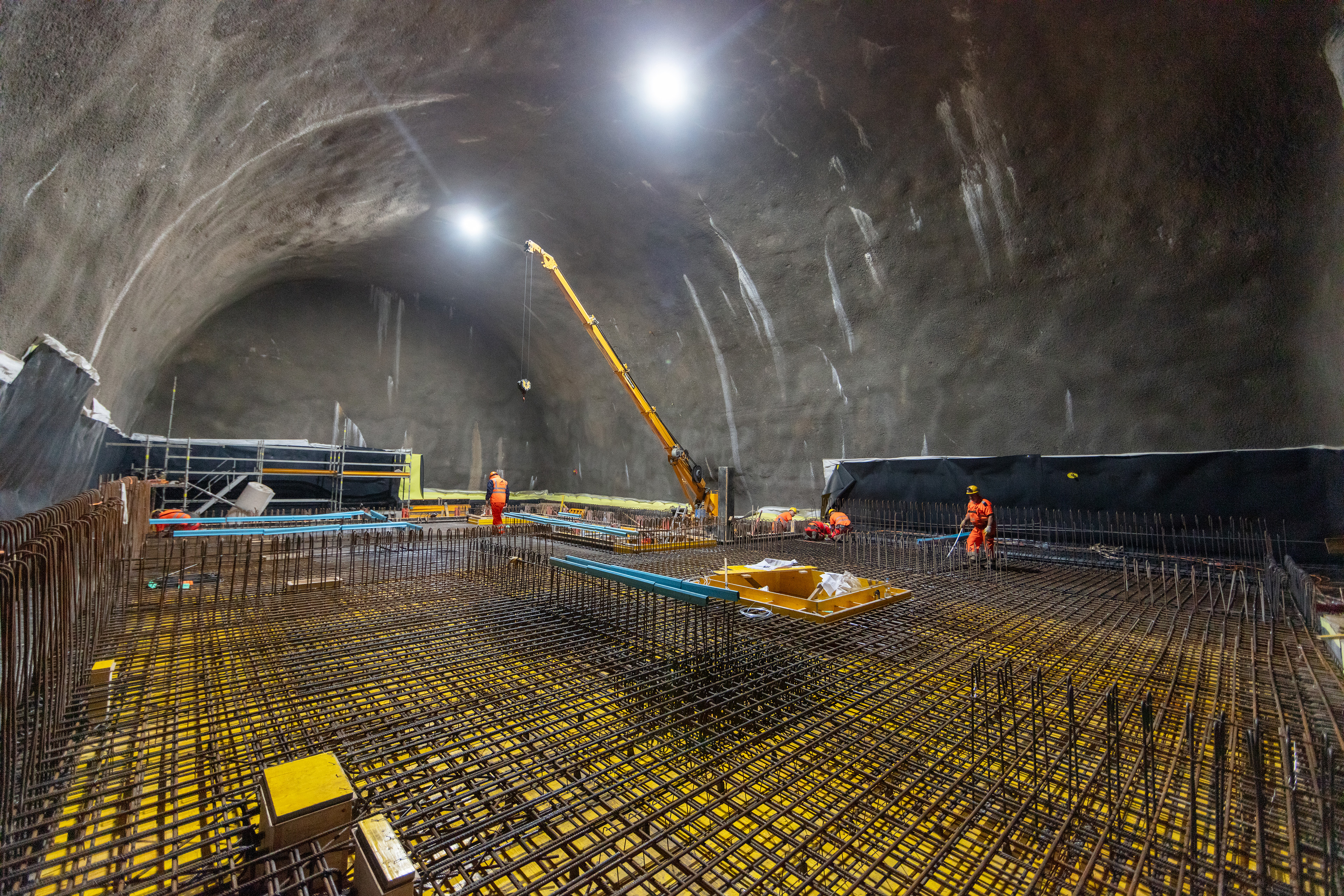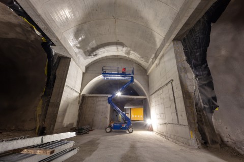 Im roh ausgebauten Sicherheitsstollen werden die vorgefertigten WELK-Elemente aneinandergereiht. Ende 2023