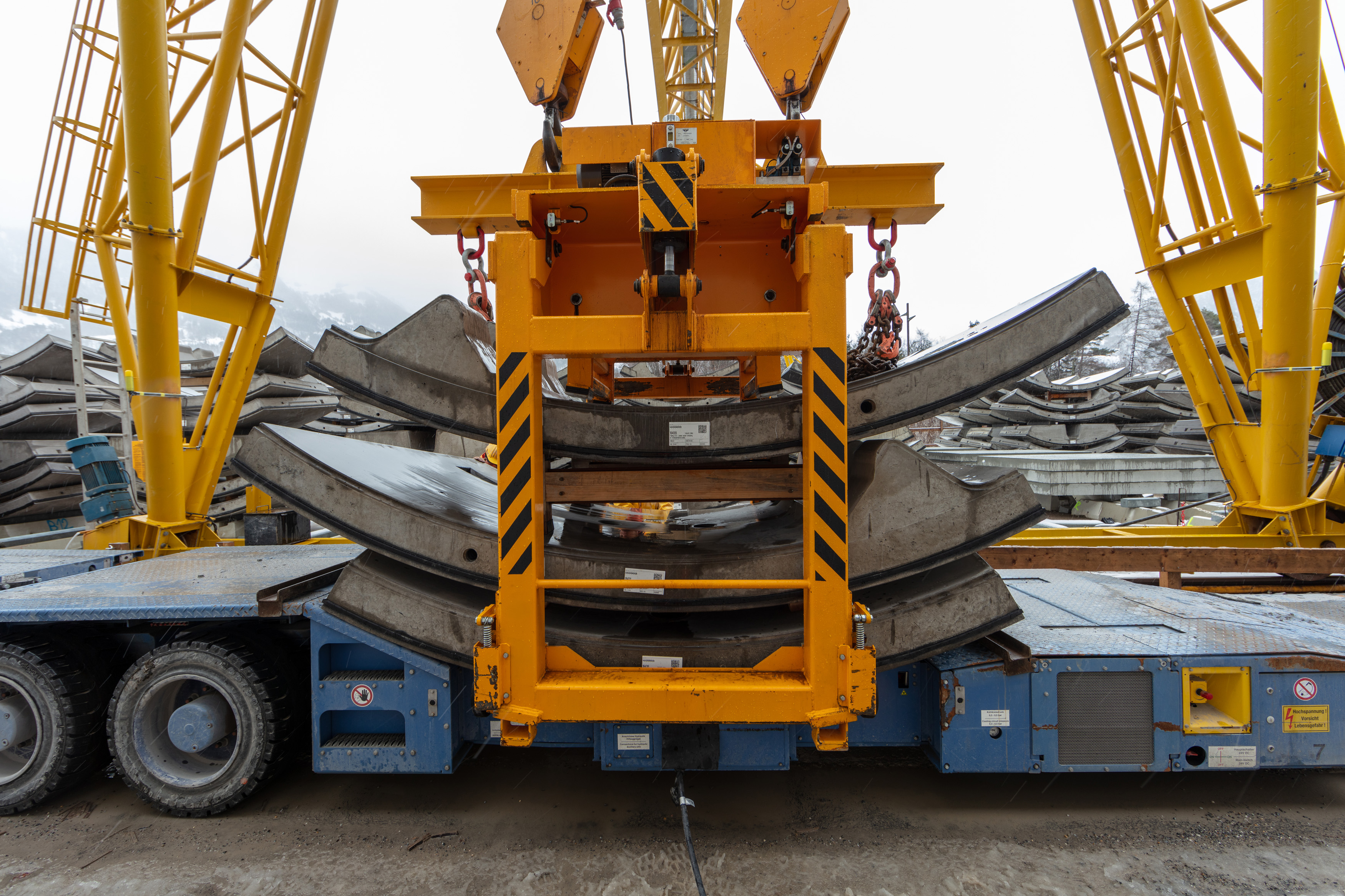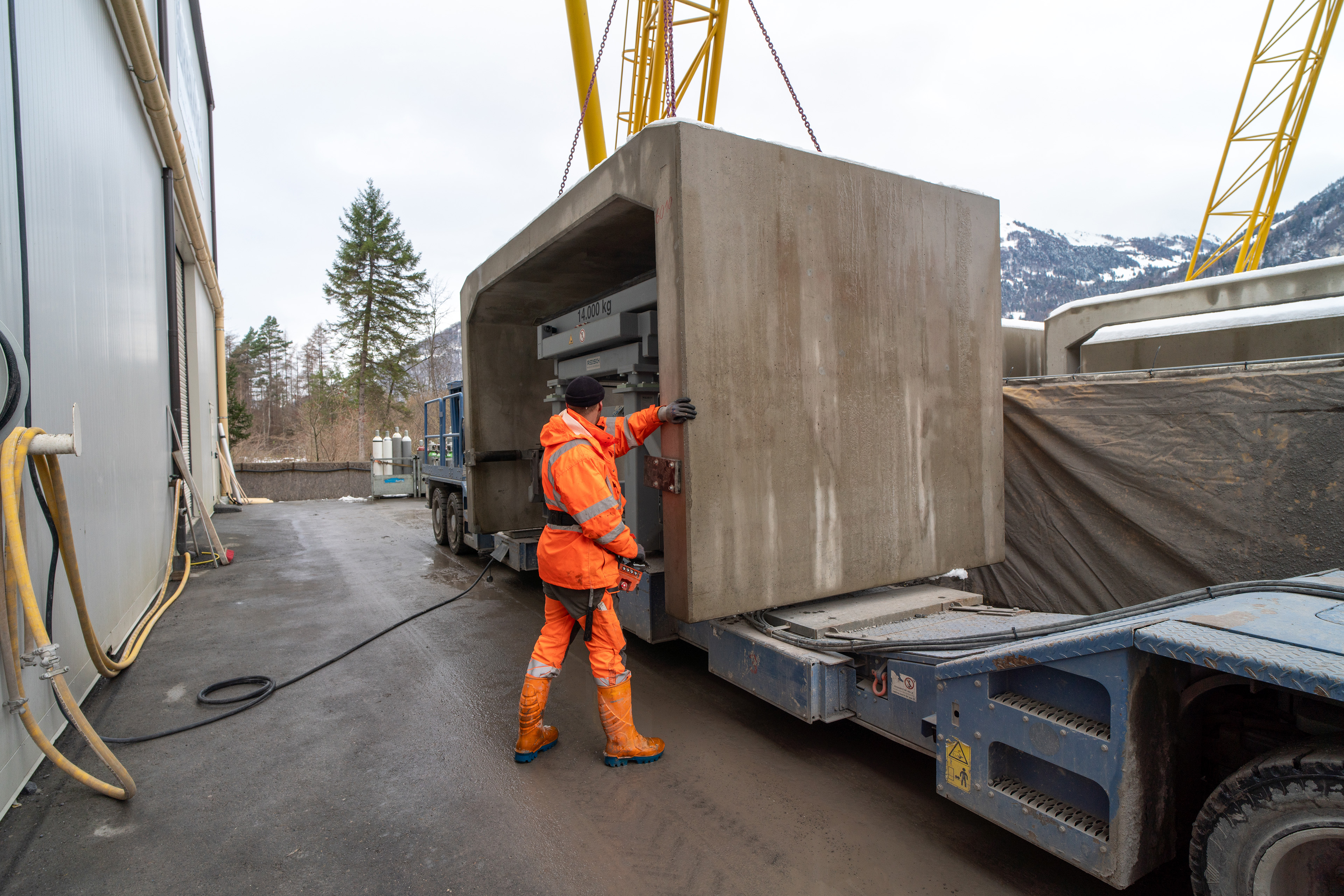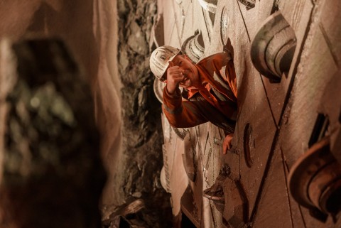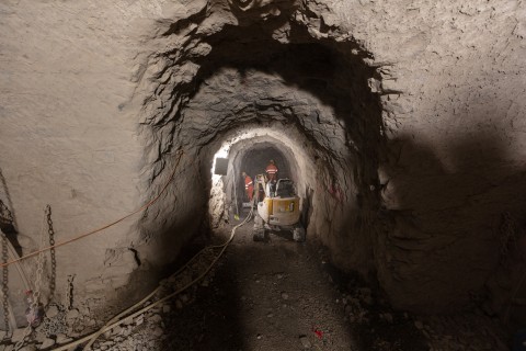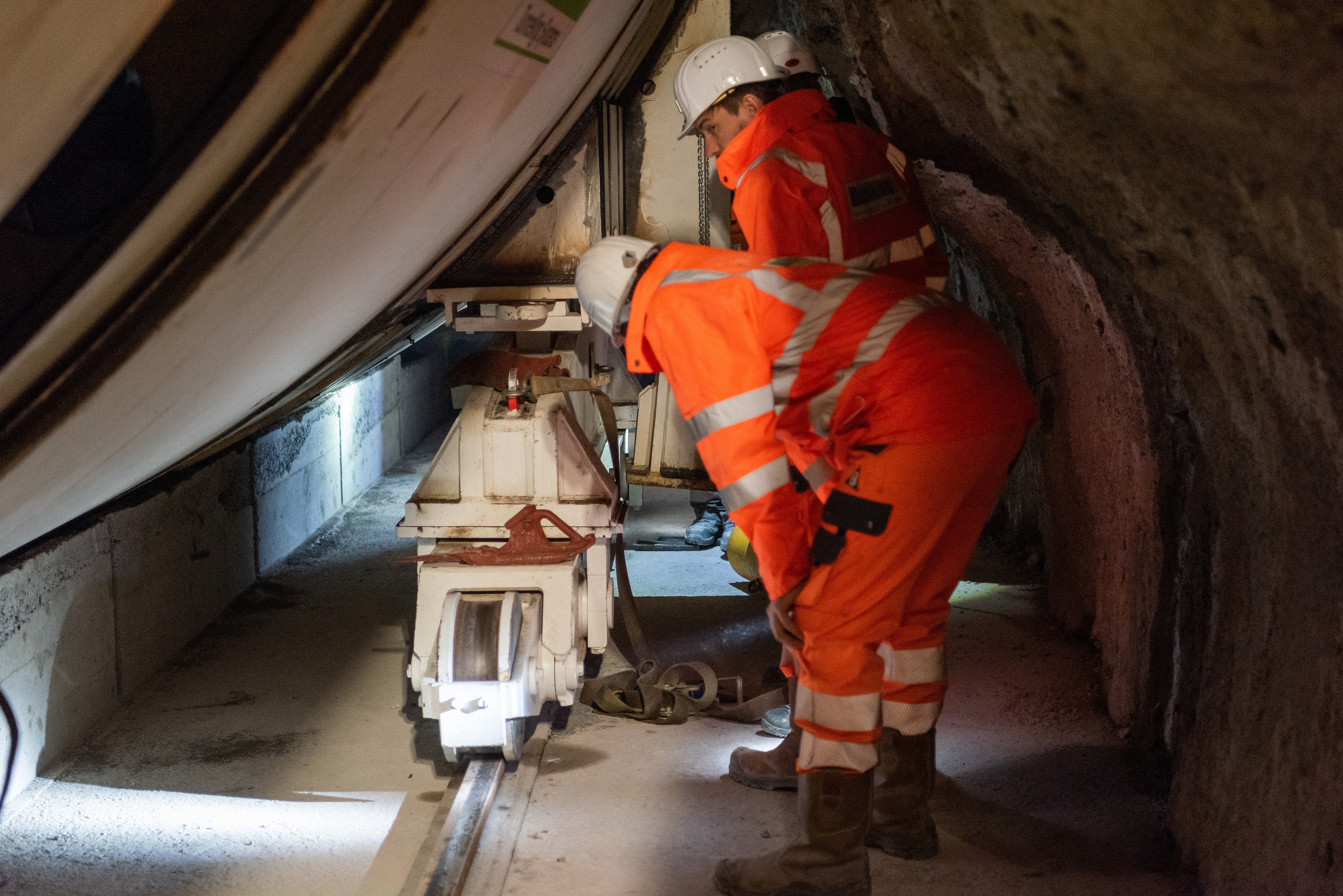 Im roh ausgebauten Sicherheitsstollen werden die vorgefertigten WELK-Elemente aneinandergereiht. Ende 2023