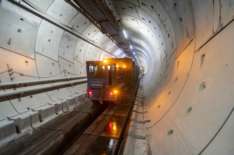 Ein ASV-Zug befördert WELK-Elemente durch den Sicherheitsstollen zur Einbaustelle.