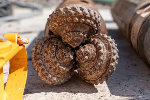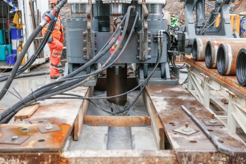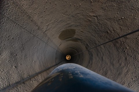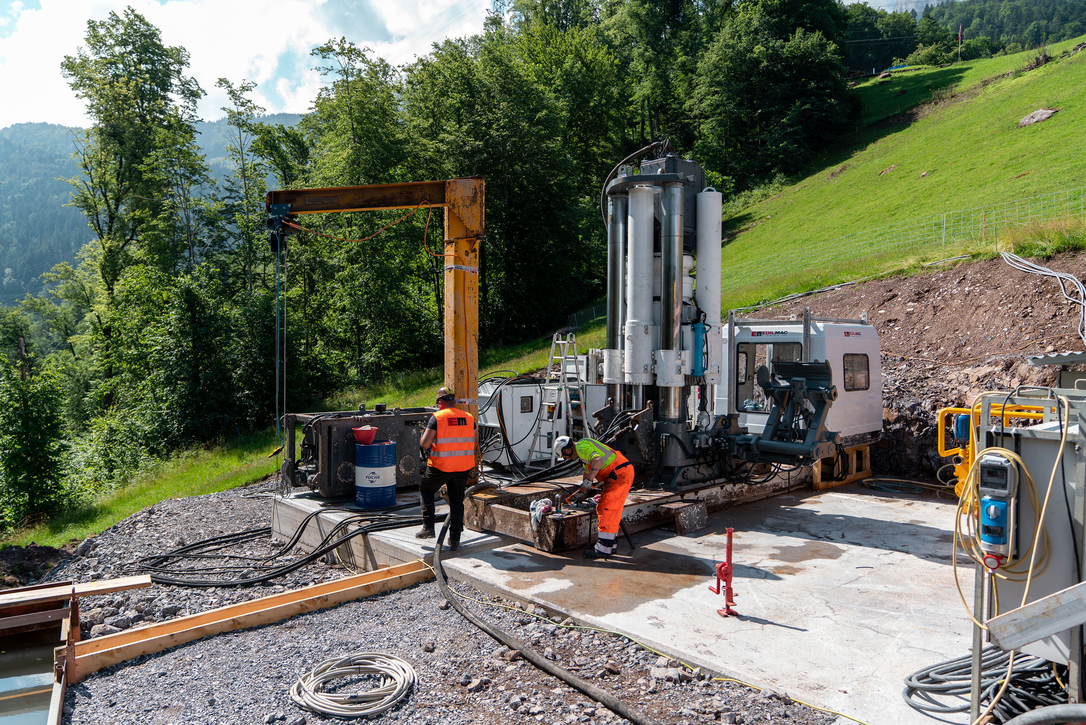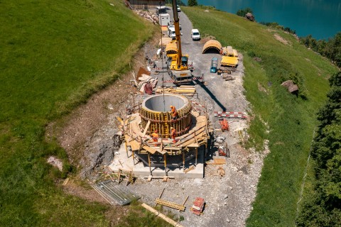 Für die Erstellung nutzten die Arbeiter das Bore-Raise-Verfahren. Dabei wurde zuerst eine vertikale Pilotbohrung mit einem Durchmesser von 30 cm bis in die Längskaverne ausgeführt. Am selben Bohrgestänge wurde eine Bohrkrone montiert, die sich wieder nach oben bohrte. Auf diese Weise entstand ein Schacht von 4.5 Metern Durchmesser, der im Kamin in Hochschleipfen endet. Das Material, das bei diesen Ausbrucharbeiten nach unten fiel, wurde mit Lastwagen aus der Kaverne transportiert.
