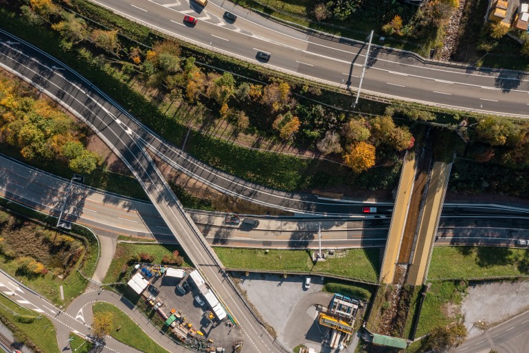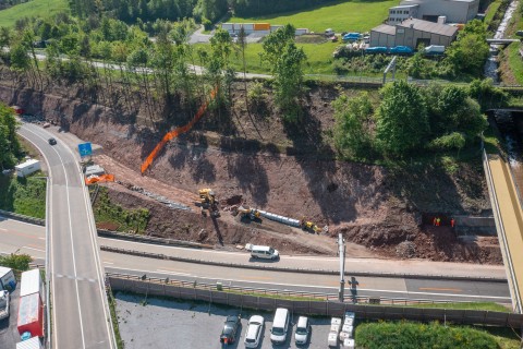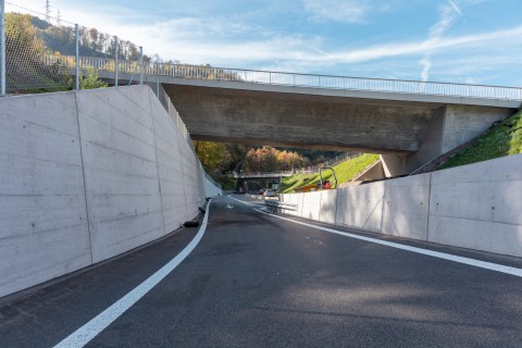 Für die Erstellung des Betriebsanschlusses wurde eine Rampe von der National- auf die Kantonsstrasse gebaut. Zur Sicherung der Strecke wurde diese zusätzlich um eine neue Stützmauer ergänzt.