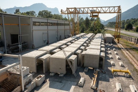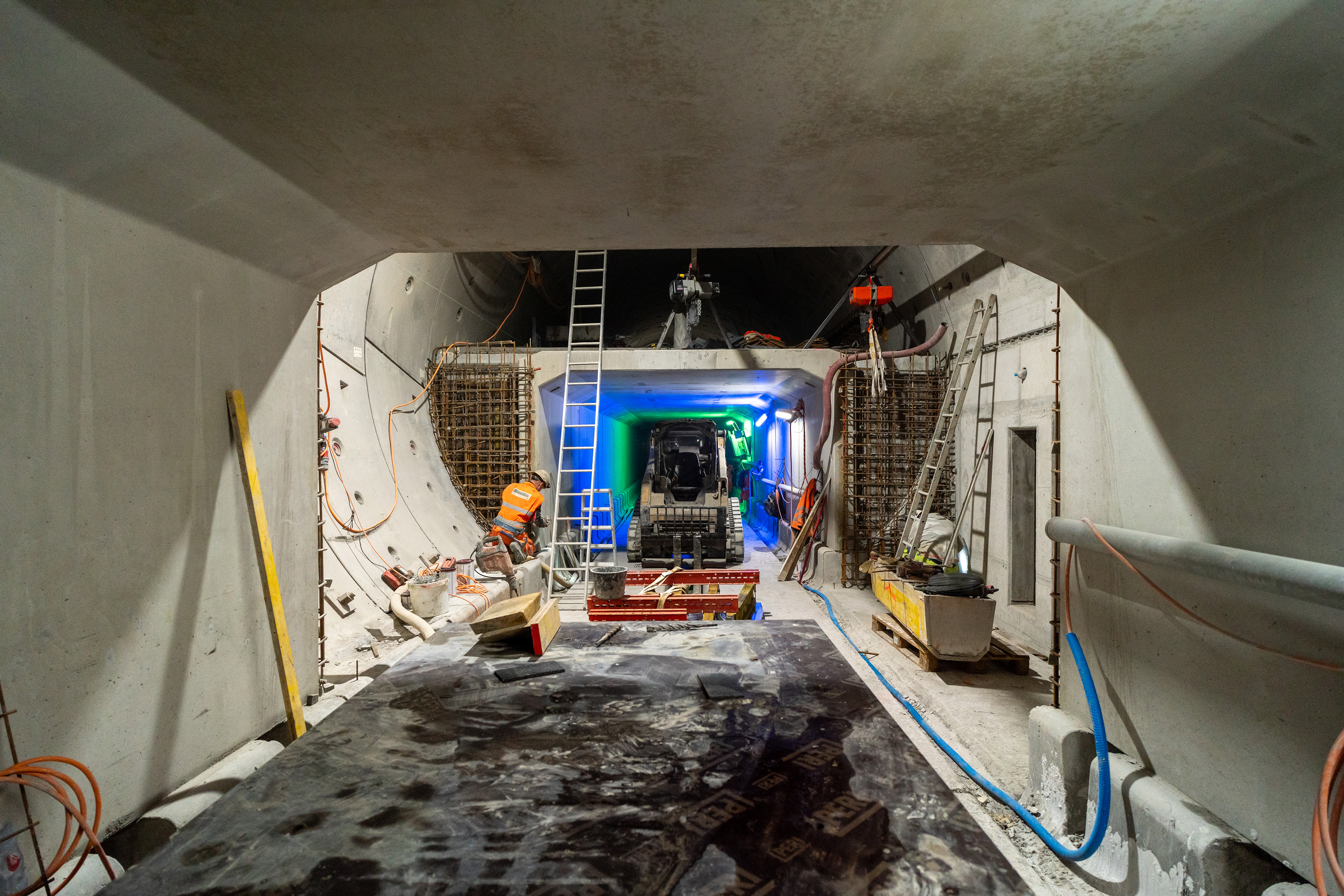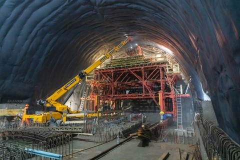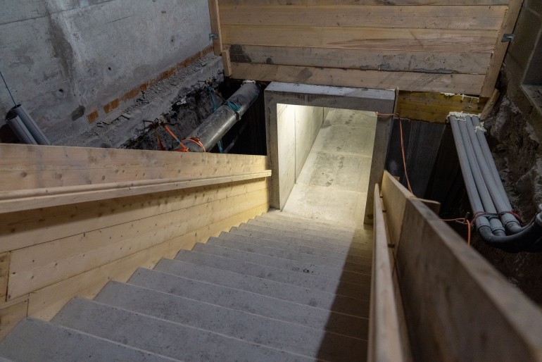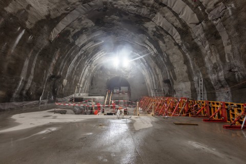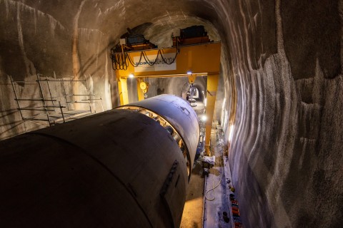Im roh ausgebauten Sicherheitsstollen werden die vorgefertigten WELK-Elemente aneinandergereiht. Ende 2023